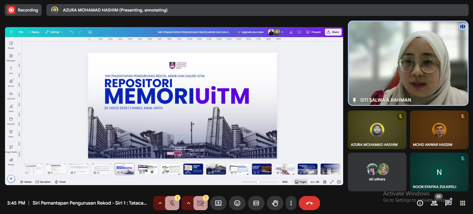 Bahagian Arkib Uiversiti (BARU) telah menganjurkan Siri 1 Pemantapan Pengurusan Rekod, Arkib dan Galeri pada 25 Ogos 2025 (Isnin), jam 2.30 petang secara dalam talian melalui pautan Google Meet.
