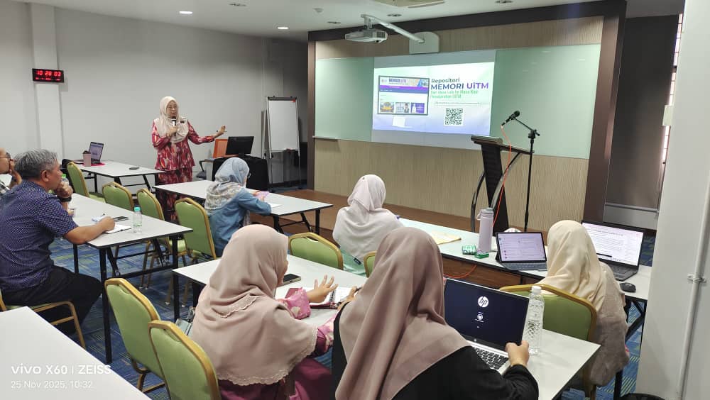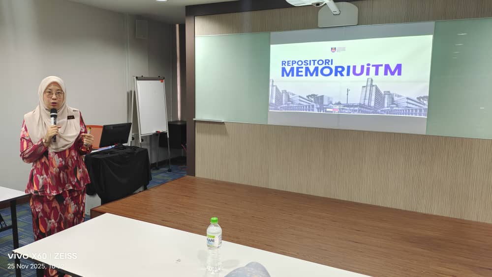 Perkongsian seterusnya disampaikan oleh Puan Siti Salwa binti A. Rahman, Pustakawan Kanan dari PTAR UiTM Shah Alam, yang membawakan tajuk berkaitan Repositori Memori UiTM. Repositori ini berperanan sebagai platform untuk mengumpul, memelihara dan mendigitalkan maklumat sejarah serta warisan institusi, termasuk peristiwa penting, naratif tokoh dan kisah komuniti yang telah membentuk identiti UiTM sepanjang perkembangan universiti.