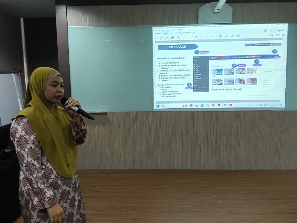 Akhir sekali, program diteruskan dengan sesi mengenai Repositori Dokumen Universiti (RDU) yang disampaikan oleh Puan Rizana binti Radwan, Timbalan Ketua Pustakawan (M)(KUP) dari PTAR UiTM Shah Alam. RDU berfungsi sebagai pusat penyimpanan digital bagi dokumen rasmi dan penting universiti yang boleh diakses secara dalam talian oleh warga kampus, sekali gus menyokong keperluan rujukan dan pengurusan maklumat institusi secara lebih efisien.