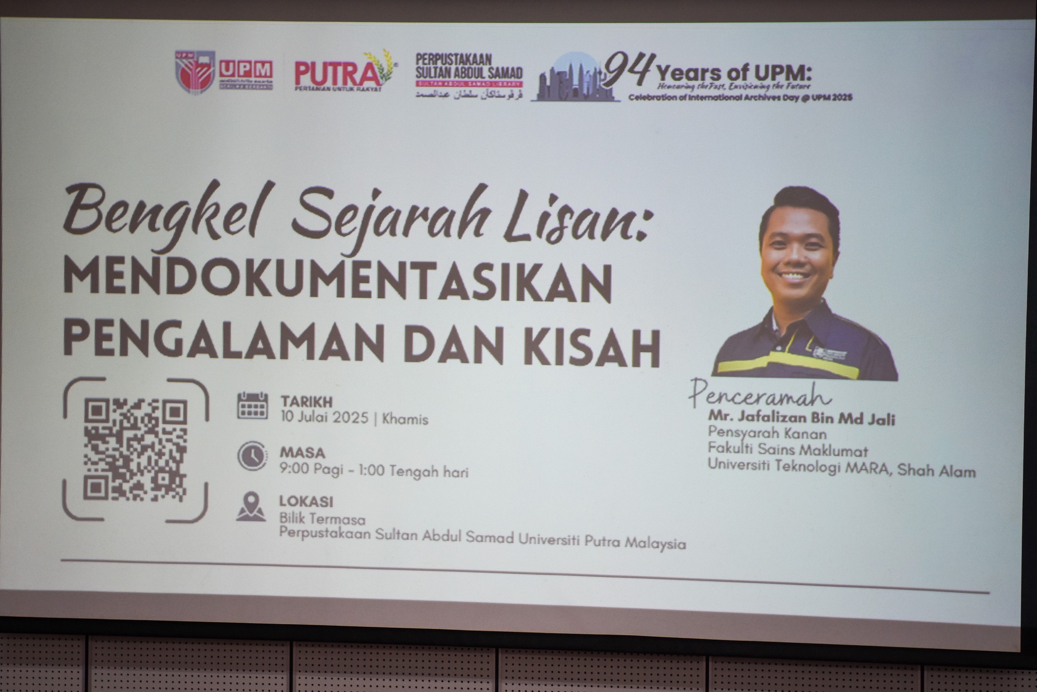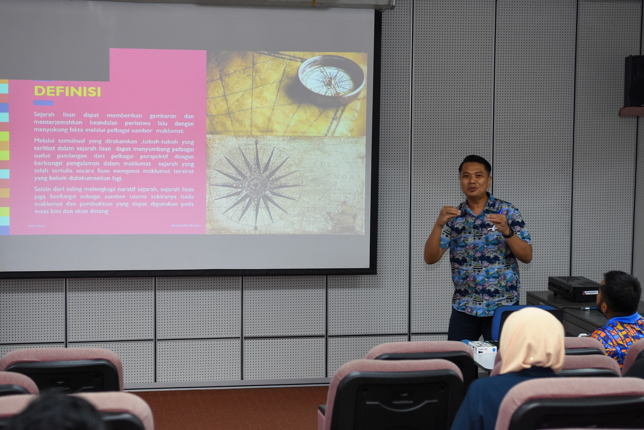 Bengkel yang dijalankan dari jam 9.00 pagi hingga 1.00 tengah hari ini dikendalikan oleh Encik Jafalizan Bin Md Jali, Pensyarah Kanan Fakulti Sains Maklumat, Universiti Teknologi MARA, Shah Alam, yang berpengalaman luas dalam bidang sejarah lisan.
