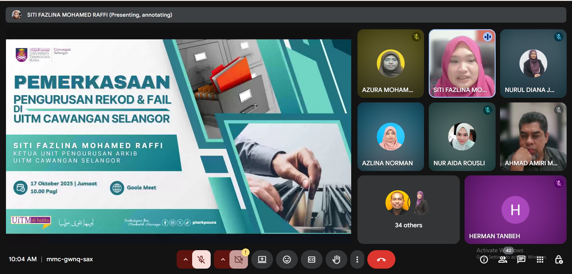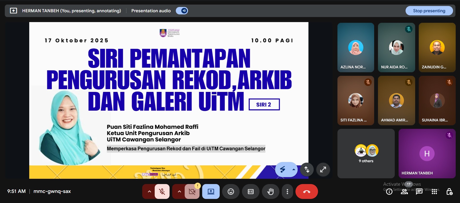 Bahagian Arkib Universiti (BARU), UiTM telah meneruskan penganjuran Siri 2 Program Pemantapan Pengurusan Rekod, Arkib dan Galeri UiTM yang diadakan secara dalam talian melalui platform Google Meet pada 17 Oktober 2025 (Jumaat) jam 10.00 pagi.
